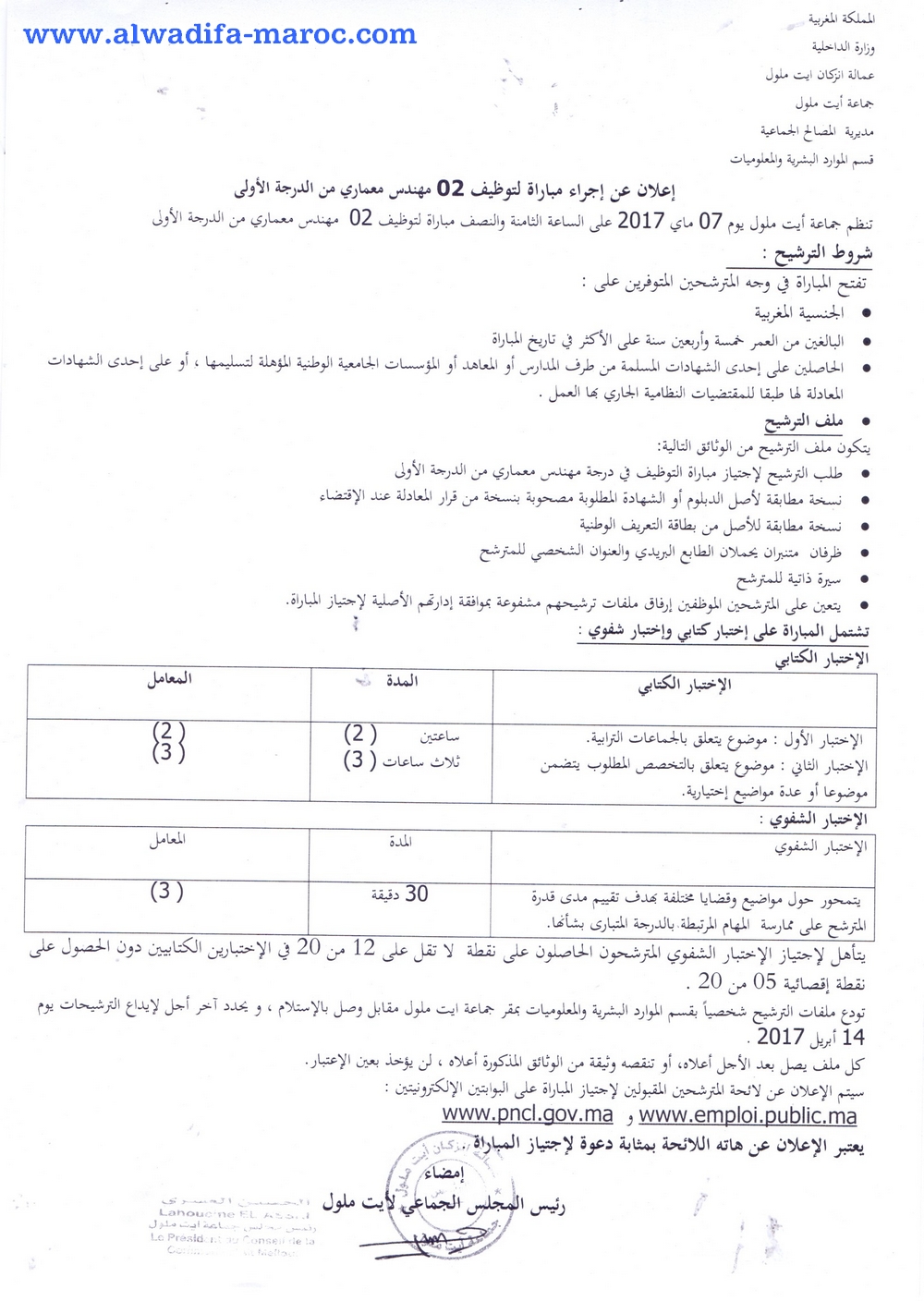 تودع ملفات الترشيح شخصيا بقسم الموارد البشرية والمعلوميات بمقر جماعية آيت ملول مقابل وصل بالاستلام، ويحدد آخر أجل لإيداع الترشيحات يوم 14 أبريل 2017